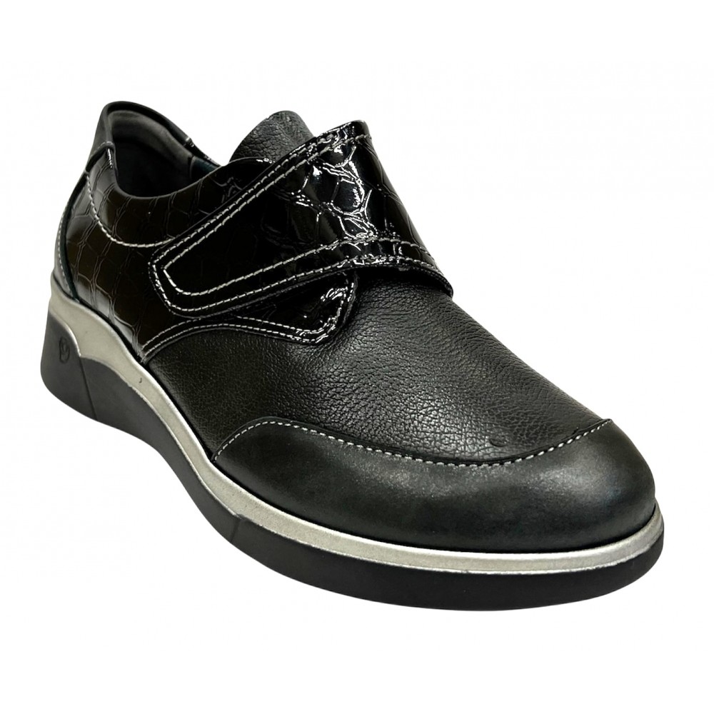 Zapato deportivo en color negro con detalles en charol, de Suave (by Leyland) para mujer, con piso de goma antideslizante con cuña de 3,5 cm de altura. Cierre mediante un velcro para una óptima adaptación y sujeción del pie. Con plantilla extraíble almohadillada. Ancho especial. Fabricado 100% en piel natural con detalle en charol y forro de piel combinado con textil.