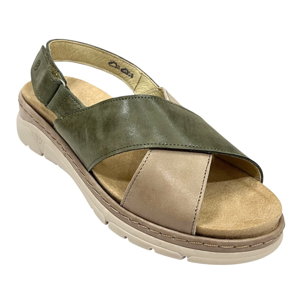 Sandalia con tiras cruzadas de Leyland (SUAVE) de color beig y verde botella, fabricada 100% en piel, con plantilla extraíble y piso de goma antideslizante de 3'5 centímetros de altura y sistema "air function". Con cierre ajustable mediante un velcro lateral para una mejor adaptación al pie. Especialmente diseñado para poder albergar plantillas ortopédicas/anatómicas con plantilla extraíble.